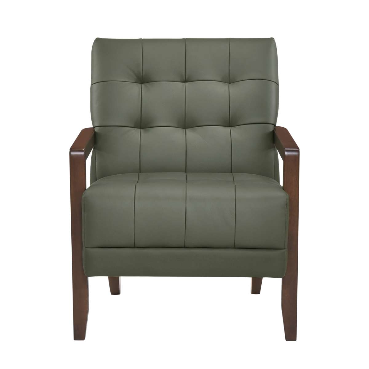 Elevate your living space with this top grain leather match accent chair, designed for timeless elegance, premium comfort, and lasting durability. Featuring a mid-century modern silhouette, deep tufted detailing, and a solid wood frame with sleek armrests, this chair blends sophisticated style with everyday functionality. The plush, high-density foam cushioning provides exceptional support, while the top grain leather match upholstery offers a luxurious look and soft, supple feel. Built with sturdy wooden legs and reinforced construction, this accent chair is perfect for living rooms, home offices, reading nooks, or bedroom seating, adding a touch of refined charm to any décor.