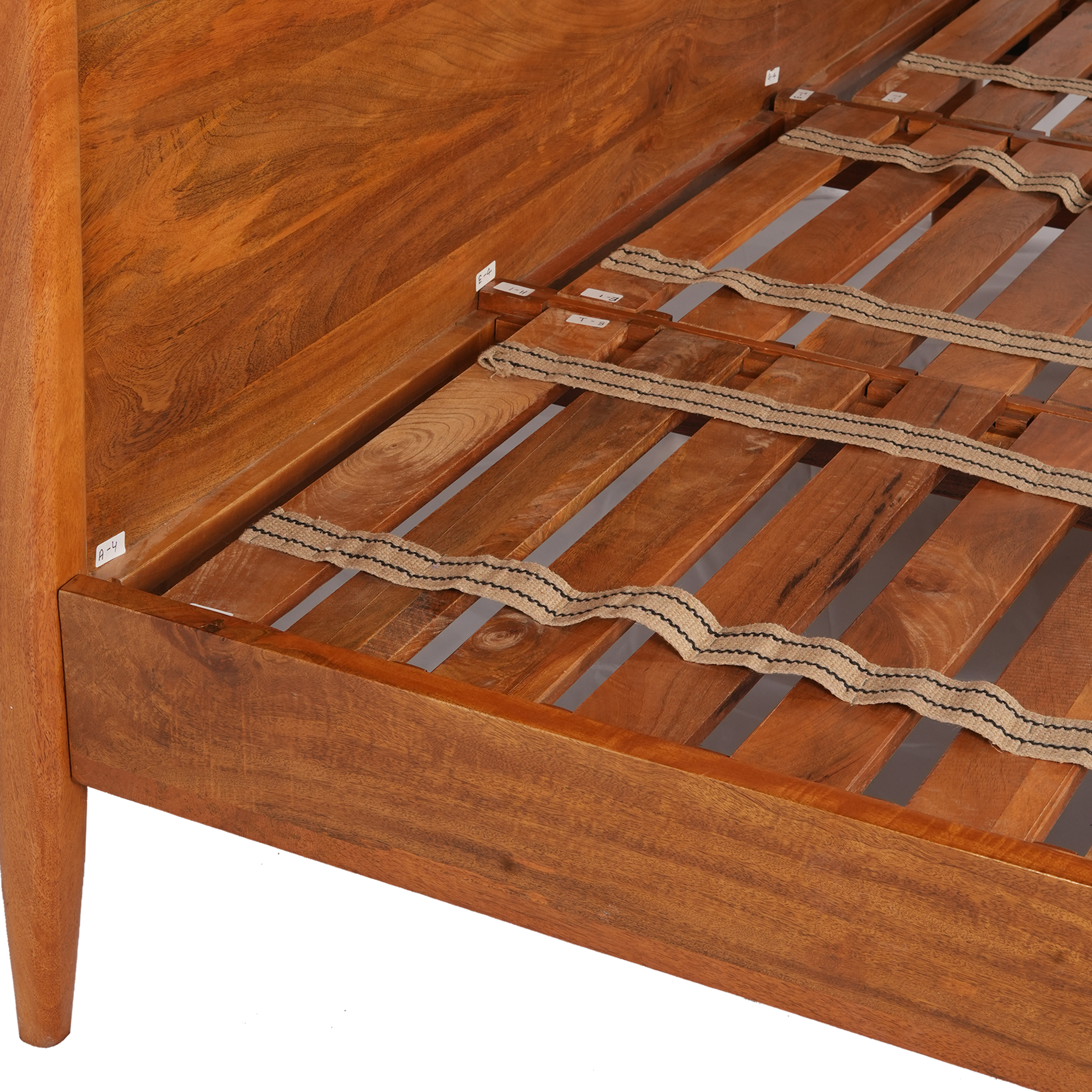 Elevate your bedroom’s aesthetic with our stunning mid-century queen bed frame, expertly crafted from durable strip pine and finished in a rich mango hue. This striking bed frame serves as a captivating centerpiece for any bedroom, seamlessly blending with a variety of mid-century design motifs. The elegant slatted headboard and straight legs provide both style and support, ensuring a comfortable and restful night’s sleep.