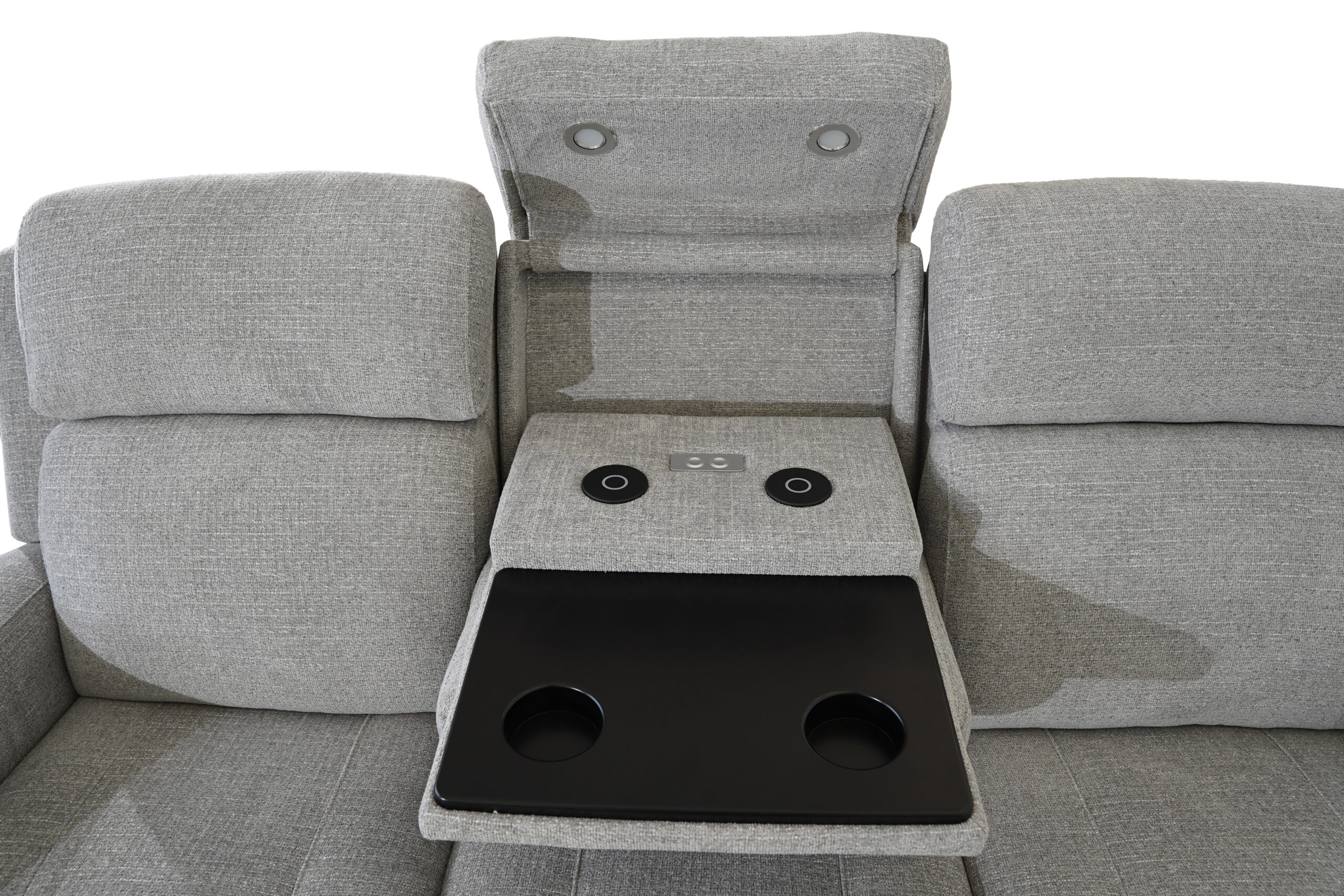 The standout feature is the innovative drop-down center seat back, which transforms into a functional console. Enjoy built-in cupholders for your favorite drinks, a solid surface ideal for snacks or devices, and integrated wireless charging to keep your phone powered without the clutter of cords. Thoughtfully included reading lights provide focused illumination, making it perfect for late-night movies or a good book.