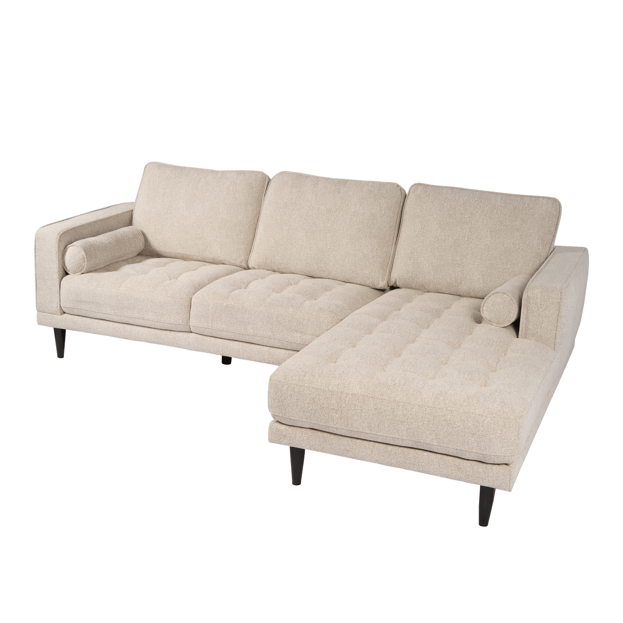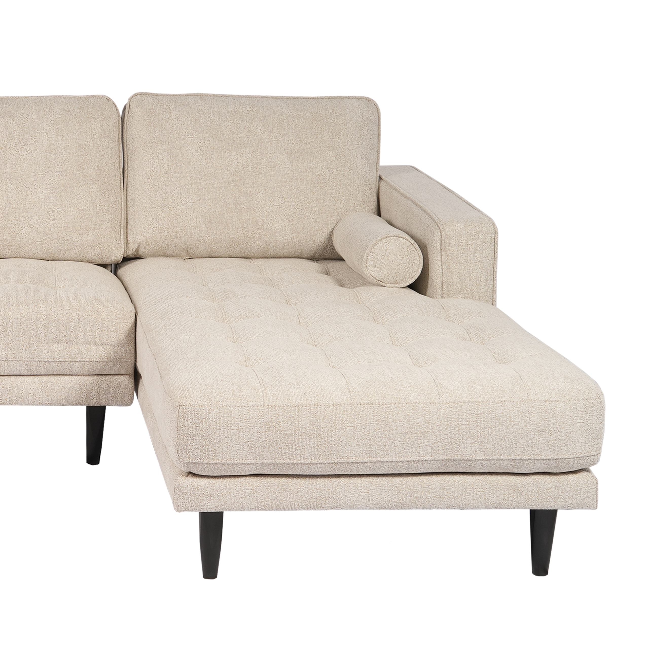 Upholstered in a soft, light neutral fabric, it features plush tufted seat cushions and supportive back cushions for everyday relaxation. The chaise provides a cozy spot to stretch out, while matching bolster pillows add both comfort and a polished finishing touch. Slim black tapered legs elevate the look with a modern feel and help keep the design light and airy.