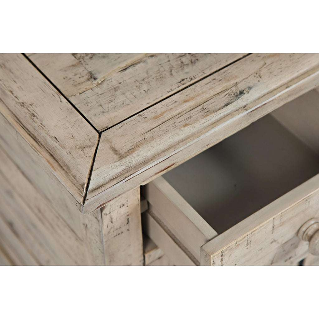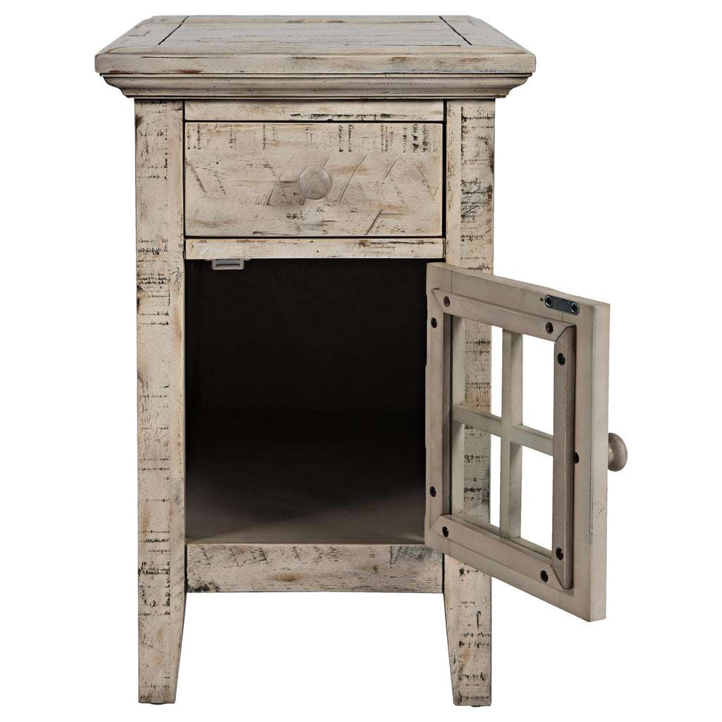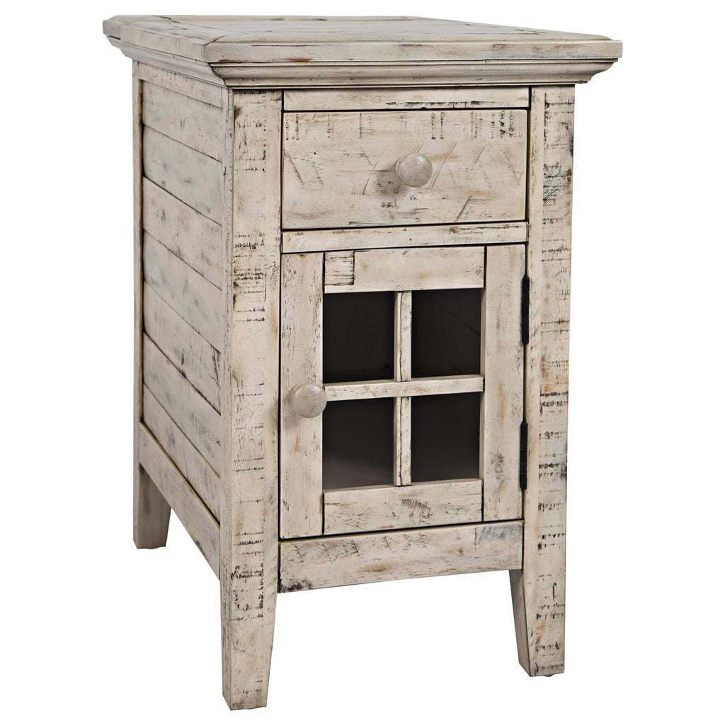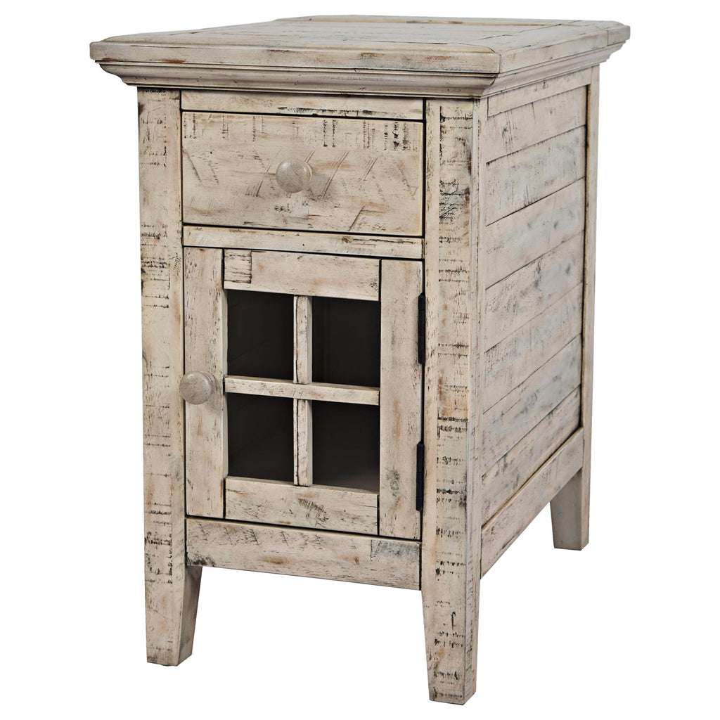 This Rustic Shores chairside table by Jofran features a relaxed vintage style with a wood top, a drawer, an open door to keep magazines, books or anything at hand